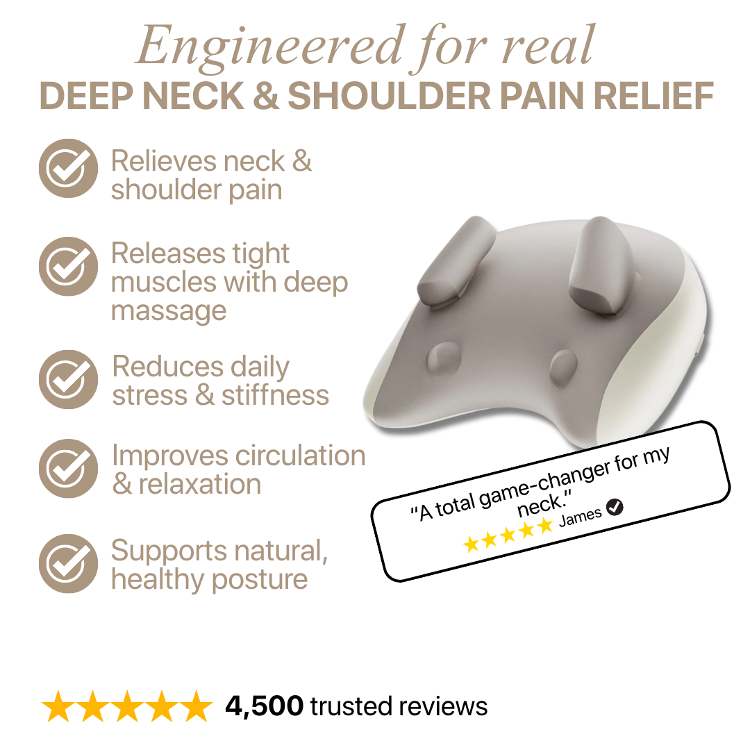Stress doesn't just live in your mind—it settles into your muscles, your posture, your breath. Pure Relief's four-prong kneading technology works through the outer muscle layers to target the deeper tissues where tension actually resides.